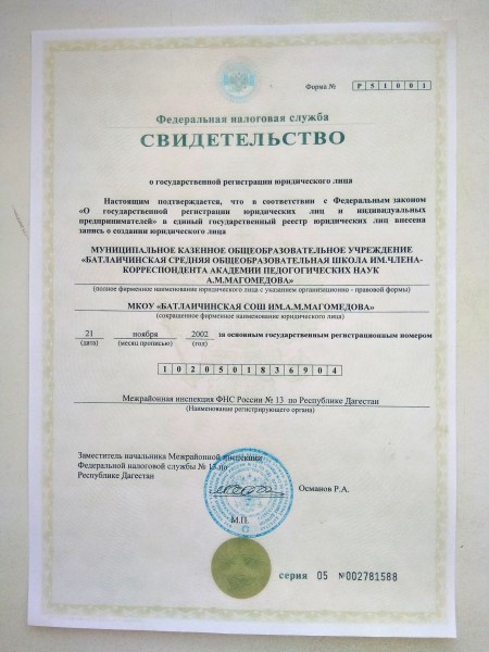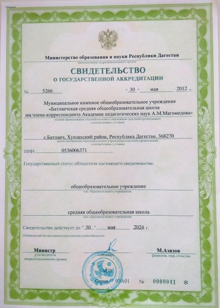 | Полное наименование образовательной организации* | Муниципальное казенное общеобразовательное учреждение "Батлаичская средняя общеобразовательная школа им. А.М.Магомедова" |